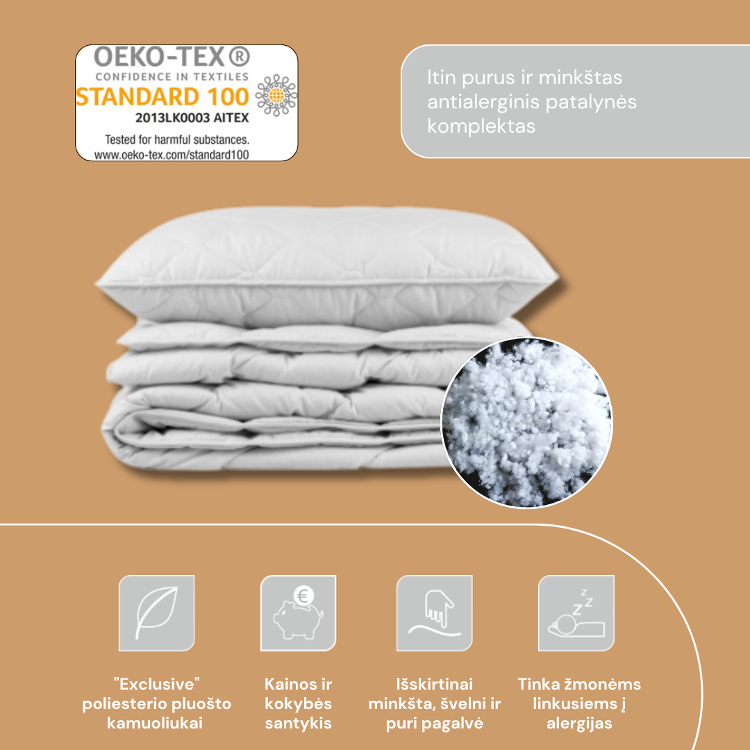 LENGVA PRIEŽIŪRA IR HIGIENA - lengva, šilta ir higieniška patalynė, skirta naudoti ištisus metus. Patalynė lengvai prižiūrima, skalbiama įprastine skalbimo mašina 60 laipsnių temperatūroje. Tokios temperatūros pakanka, kad būtų sunaikintos įvairios bakterijos bei dulkių erkutės, taip sukuriant saugią ir švarią miego aplinką.