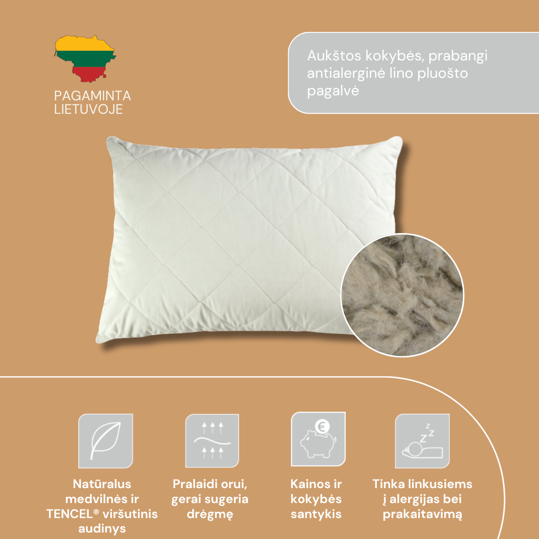 Pagalvė su Lino pluoštu, išskirtinai Lietuviškas gaminys. Linas tai vienas seniausių Lietuvoje naudojamų natūralių augalinių pluoštų. Lino pluoštas laidus orui, greitai džiūsta. Tinka žmonėms turintiems jautrią odą ir linkusiems į prakaitavimą (lino pluoštas gali įgerti iki 20% savo svorio ir nebūti šlapias).