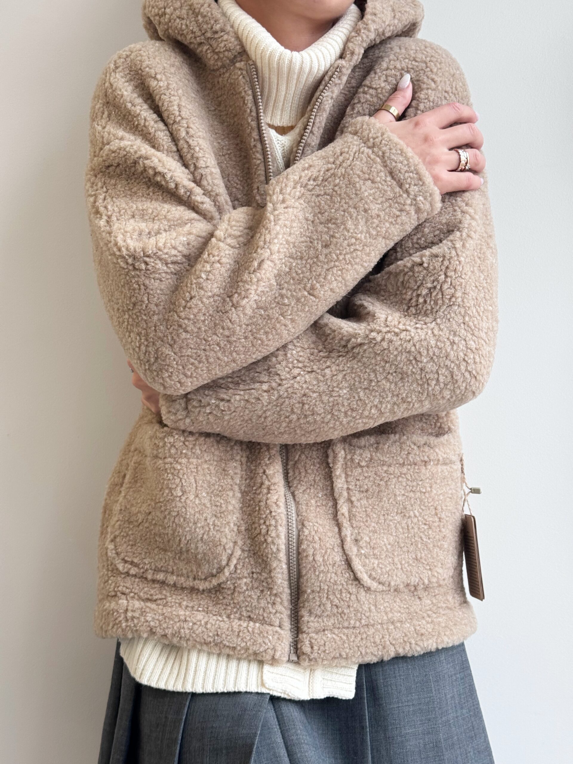 Minkšta ir labai šilta moteriška striukė su gobtuvu. Turi dvi mažas kišenes, užsegimas užtrauktuku, dizainą papildo ekologiškos odos detalės.